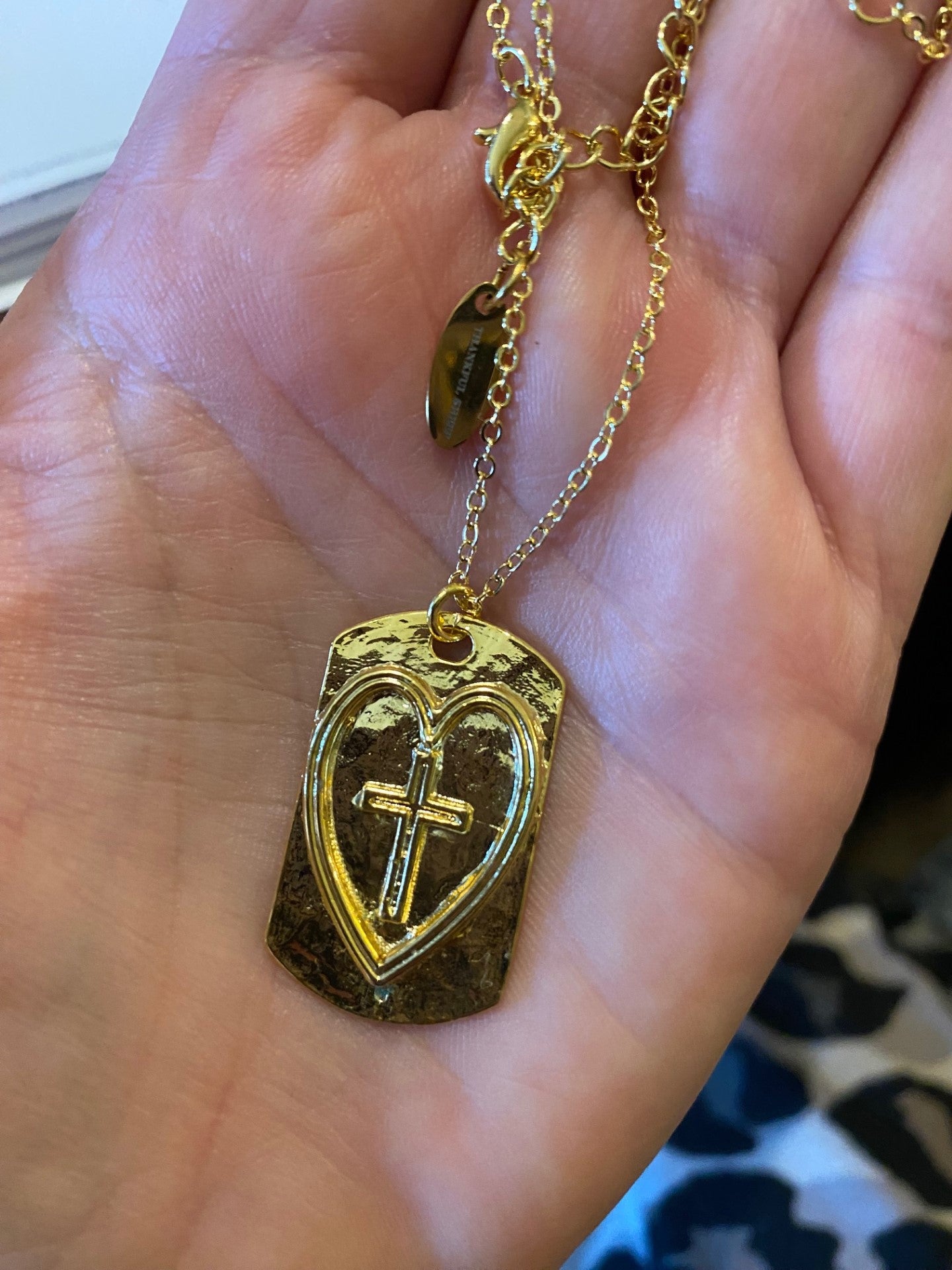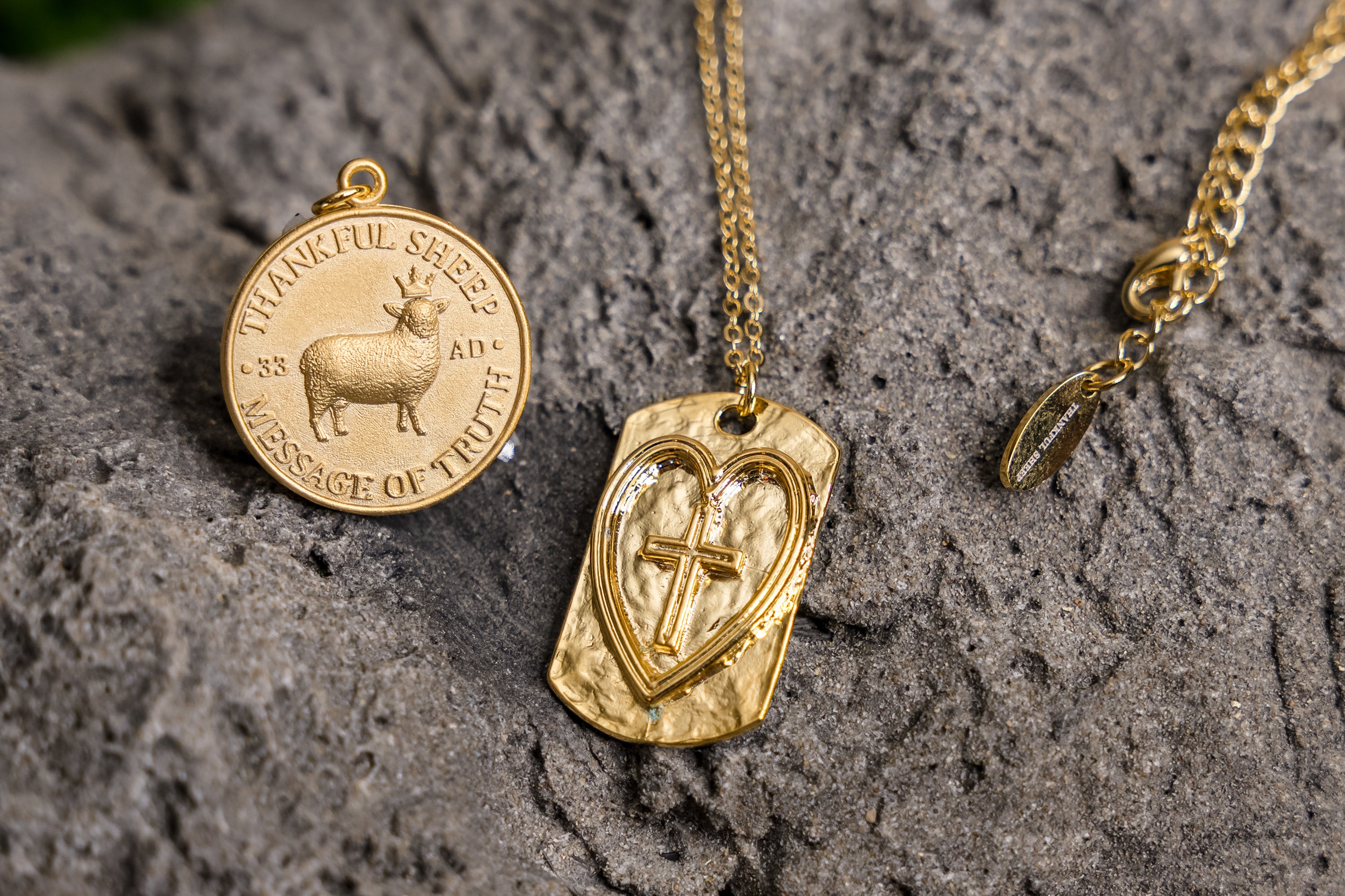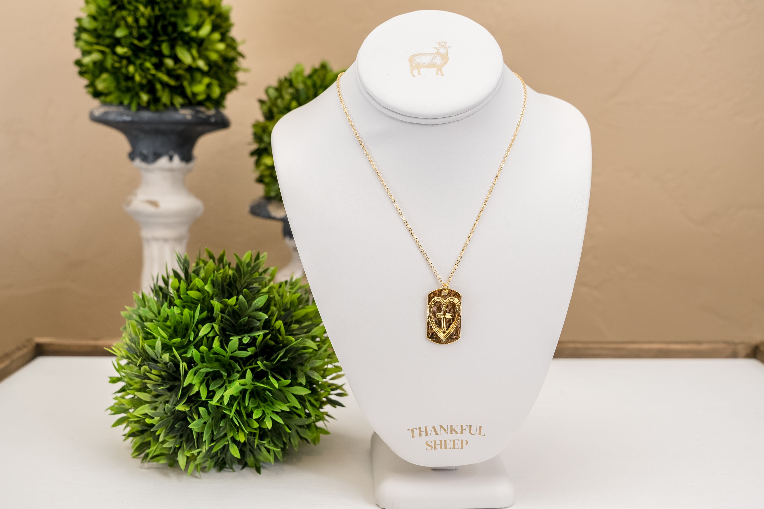 This Thankful Sheep necklace is symbolic of so much. The piece has a cross inside of a heart on a hammered tag. Be thankful always! This is a John 3:16 piece.